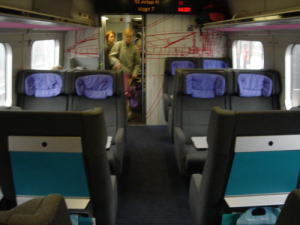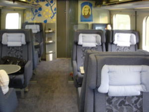 紅茶やコーヒーの無料サービスはありません。ただ、座席幅は十分の広さが確保され、フランスのTGVに比べても広い感じがします。 2等でも快適ですが、1等との差額を考えると、1等に乗っていろいろなものが無料なので、1等の方がかなりお得感があります。 |