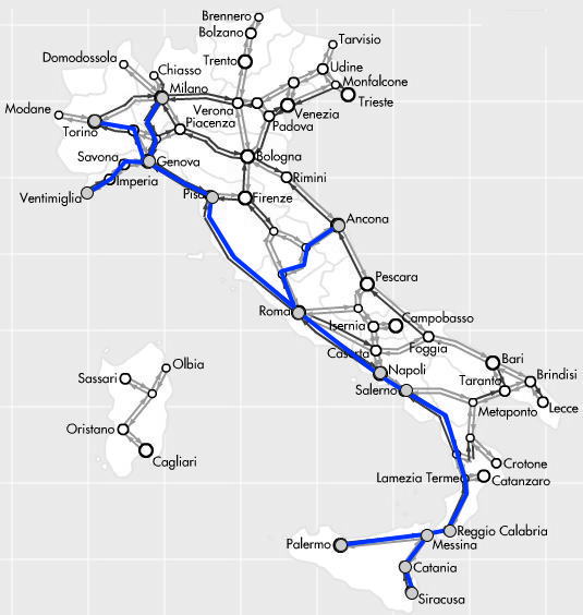 イタリア鉄道の特急列車。FSInterCity機材は高速列車がカバーしていない中堅都市の区間に導入されております。特に隣国のフランスへ海沿いを通ってニースへ行くときは、2013年現在、直通列車の運行が再開しておりませんのでこのFSInterCity機材で国境駅Ventimiglia駅まで移動して、フランスの列車に乗り換えで移動します。