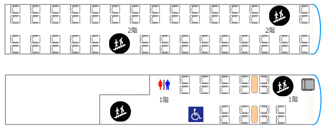 また、2階建てバスの1階にテーブル付四人掛け座席がありますが、後ろ向きになる方がいるのでお勧めしません。 |