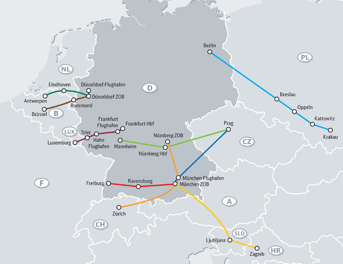 人気路線は直通列車の運行がない、プラハ - ニュルンブルグ間 と ベルリン - クラクフ間。全席指定のバスで事前に日本から予約ができるので安心して乗車できます。全9路線の中で、6路線で2階建てバス、3路線で1階建てバスを使用。