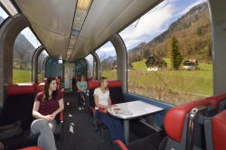 以前、Luzern---InterlakenOst間で導入していたパノラマ車両。1等車両ですが、通路挟んで2席+2席のつくりになってます。Luzern---InterlakenOst間に新車が導入されたことで、Luzern-Engelberg間に導入されました。