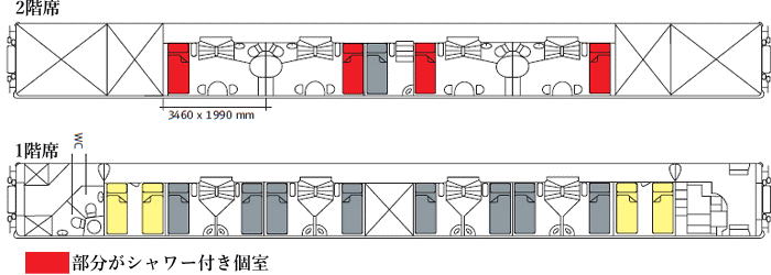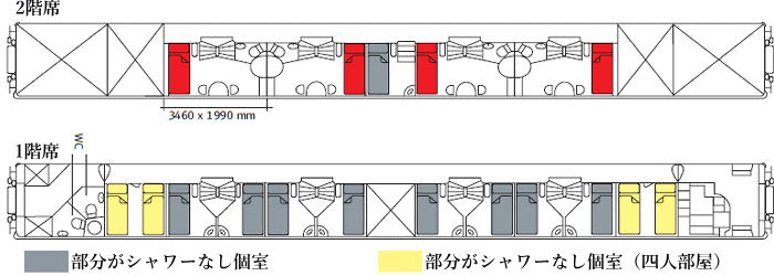 通常の寝台車両はベットのみですが、2階建て型のシャワー付寝台は、ベットと座席とテーブルとシャワー・トイレルームがそれぞれ独立していて夜行列車には珍しく窮屈感がない車両だったので、引退が惜しまれます。