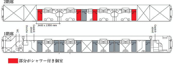 また、Munchen-Berlin/Hamburg線にのみ、2階席に9部屋あります。2階席で確保することで走行音が比較的静かになります。