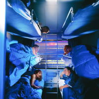 コネクティングルームを2名で利用すると、2名とも下段ベッドになり梯子の上り下りが不要になります。足の悪い方にお勧め |