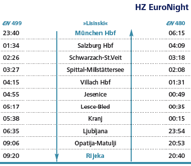 かつてのバイエルン王国の都ミュンヘンとクロアチアの港湾都市リジェカを結ぶユーロナイト。途中、スロベニアの首都リュブリャナにも停車します。