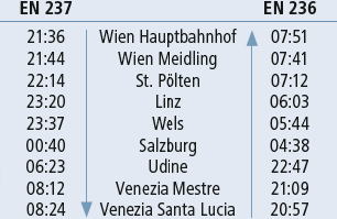 朝食サービスの有無、寝台車両の等級は情報元のヨーロッパ鉄道チケットセンターで購入した場合のみに適用されます。ヨーロッパ鉄道チケットセンター以外の会社で購入する場合は、朝食サービスの有無、個室寝台車両に適用される等級が違う場合がありますので、購入する会社でご確認ください。 |