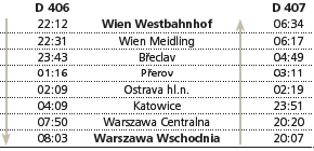 朝食サービスの有無、寝台車両の等級は情報元のヨーロッパ鉄道チケットセンターで購入した場合のみに適用されます。ヨーロッパ鉄道チケットセンター以外の会社で購入する場合は、朝食サービスの有無、個室寝台車両に適用される等級が違う場合がありますので、購入する会社でご確認ください。 |