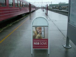珍しいことが一つあります。個室寝台車両を利用の方は、NSB Meny というカフェ車両でチェックインして乗車する仕組みになっています。カフェ車両の位置はわかりやすい様にホームに看板が出ております。