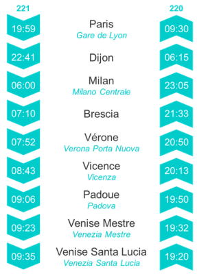 ヨーロッパの人気都市のパリとヴェネチアを結ぶ国際夜行列車。現在は独立した会社が経営している私鉄です。国鉄経営時代はアルテシアナイトと呼ばれていた夜行列車。