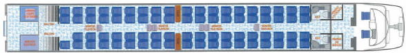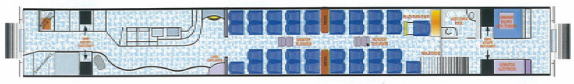 オープンサロンタイプの通路挟んで2席+2席の配置。車両の中心に1か所だけテーブル付座席があります。座席は固定されていてJRの新幹線のように回転しません。