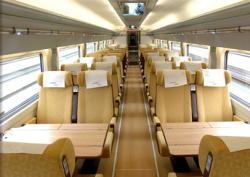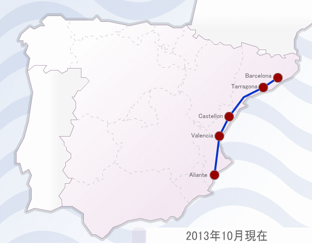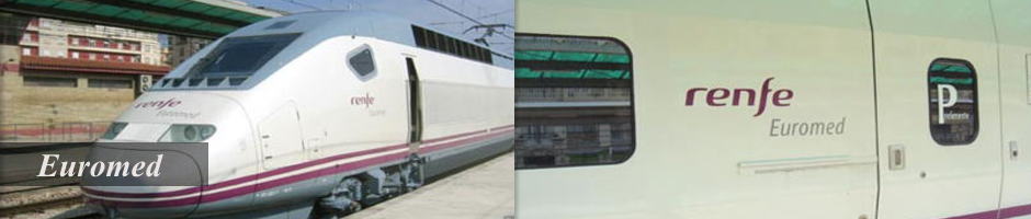 美しい地中海沿岸を快走するユーロメッドはAVE(100型)をベースに製造された高速列車。Barcelona-Valencia-Alicante間を営業区間としていて、Barcelona-Valencia間においてはこのユーロメッドの他に、タルゴとアルビアとインターシティとMDが導入されています。この5種類の機材の中でユーロメッドが最もスピードが速い列車(時速220q)です。