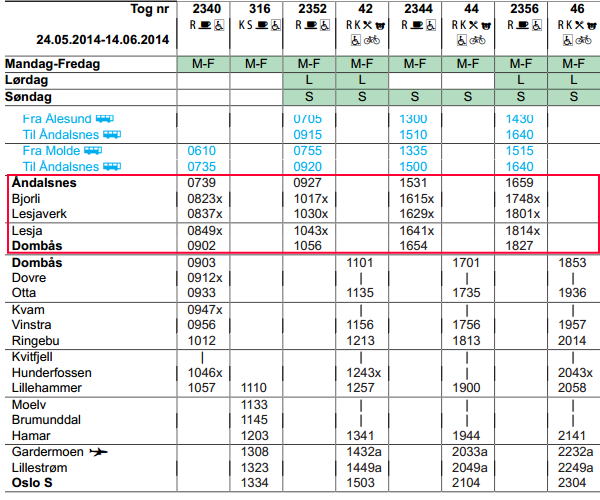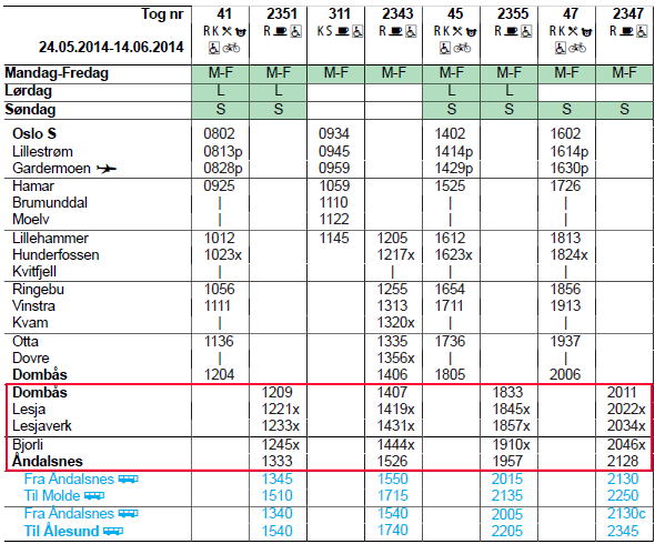 Andalsnes駅は、沿岸急行船が発着するMoldeや空港のあるAlesundへ行く為の交通の要所にもなります。Andalsnes駅からAlesund或いはMoldeまでは列車の到着時間と連動したバス(時刻表)が運行されています。