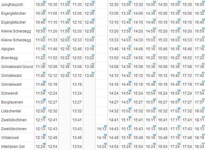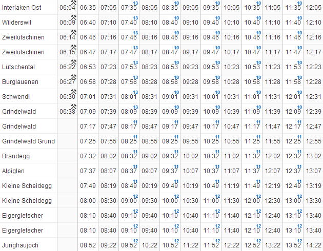 | インターラーケン → グリンデルワルト → クライネシャディック → ユングフラウヨッホ |
