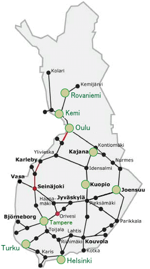 フィンランドの特急列車。機材は2種類あり、InterCity機材とInterCity2機材。InterCity機材は2階建て車両と1階建て車両の混合編成。InterCity2はオール2階建て車両。食堂車はInterCity車両機材にのみ連結されています。InterCity2機材には食堂車は連結していませんが車内販売があります。
