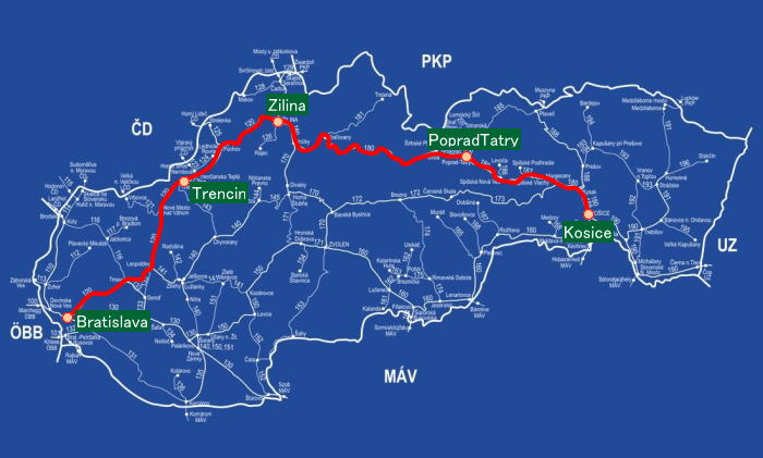 スロバキア国鉄の特急列車 ZSSK InterCity機材。全席指定の列車。他のヨーロッパ諸国に比べると鉄道の発展が遅く、Bratislava-Kosice間のみ全席指定列車が運行されています。その他の路線はすべてローカル列車区間になっており乗車券のみ、或は、鉄道パスのみで乗車できる全席自由席のローカル列車になってます。今後のスロバキア国鉄の発展に期待。